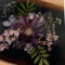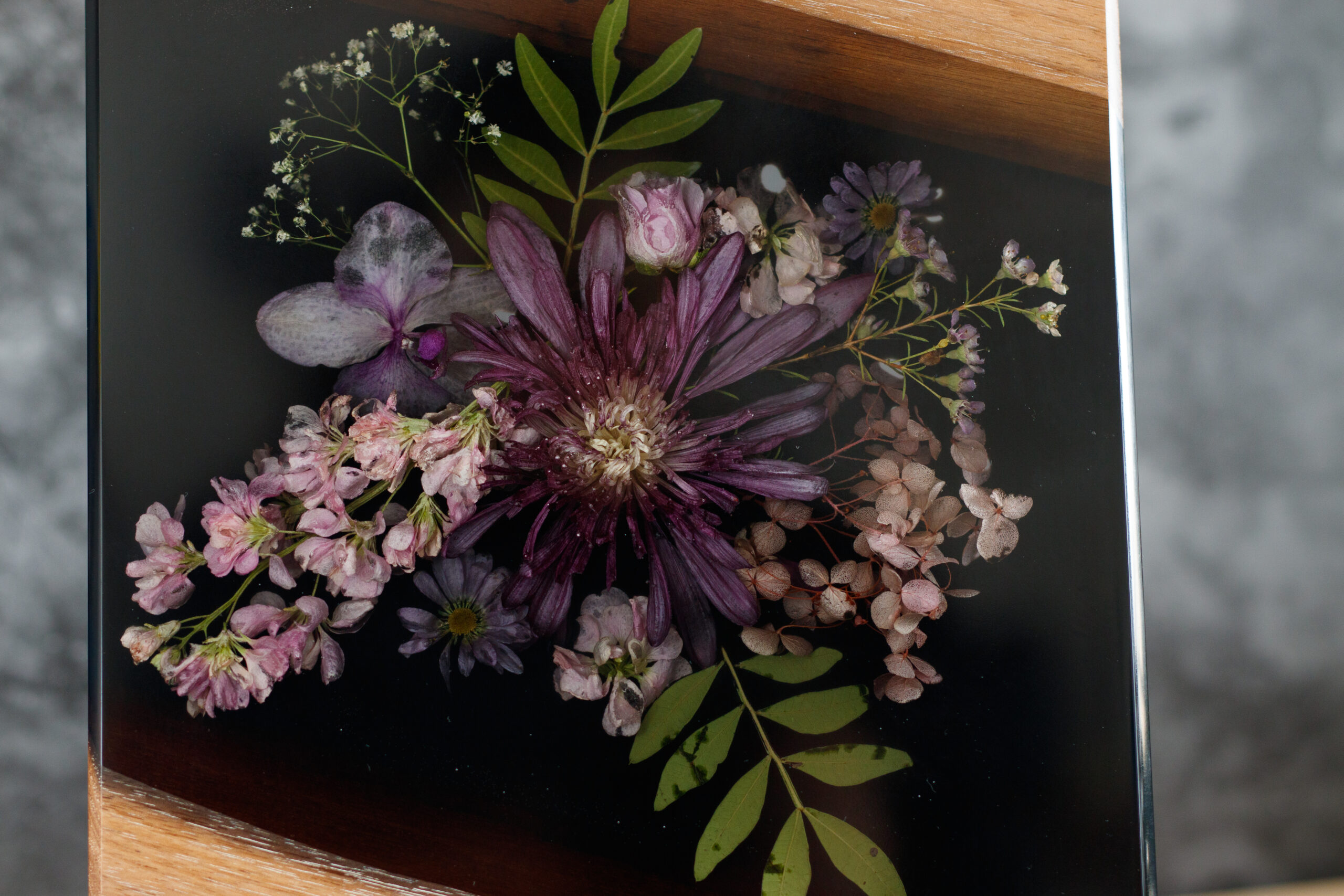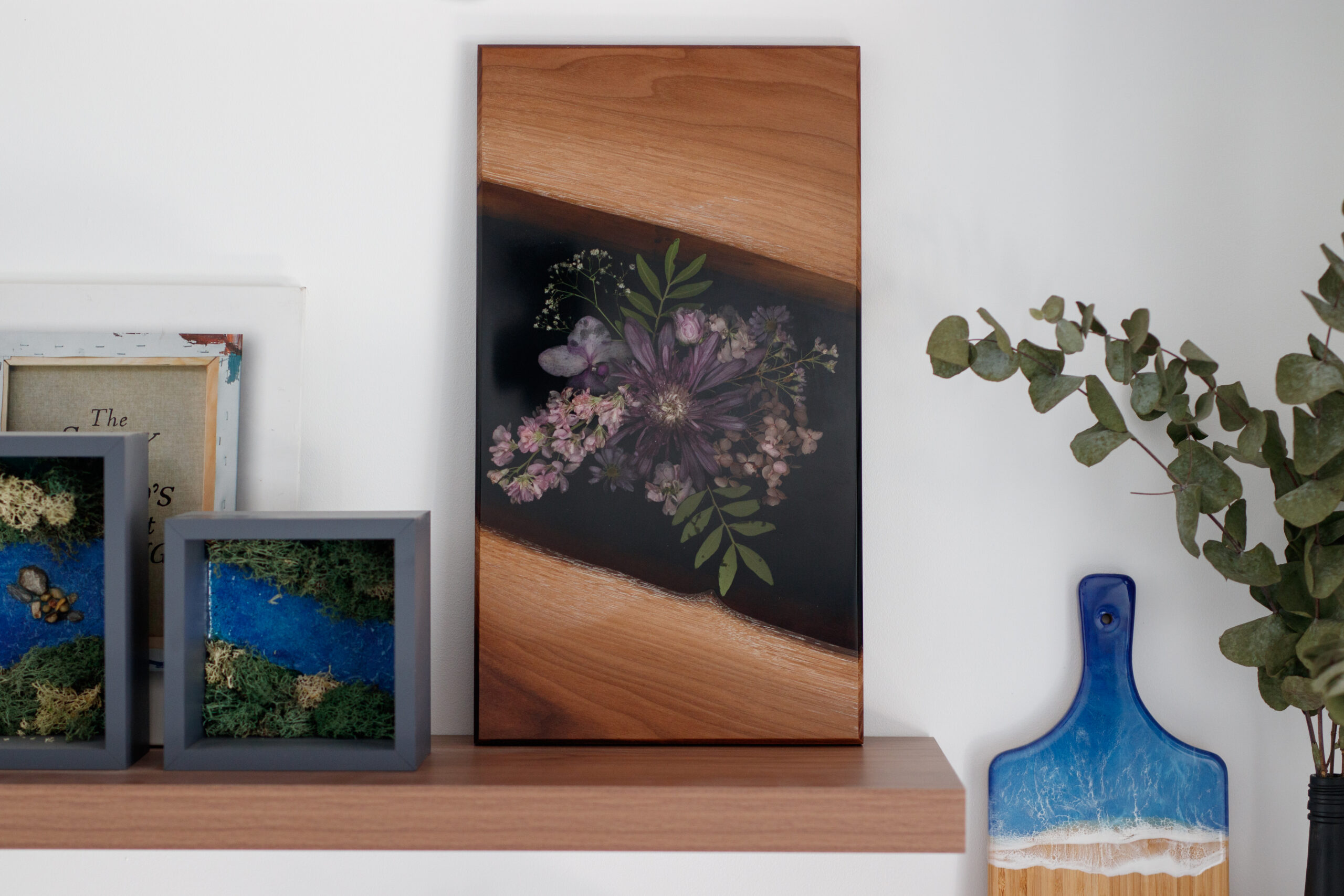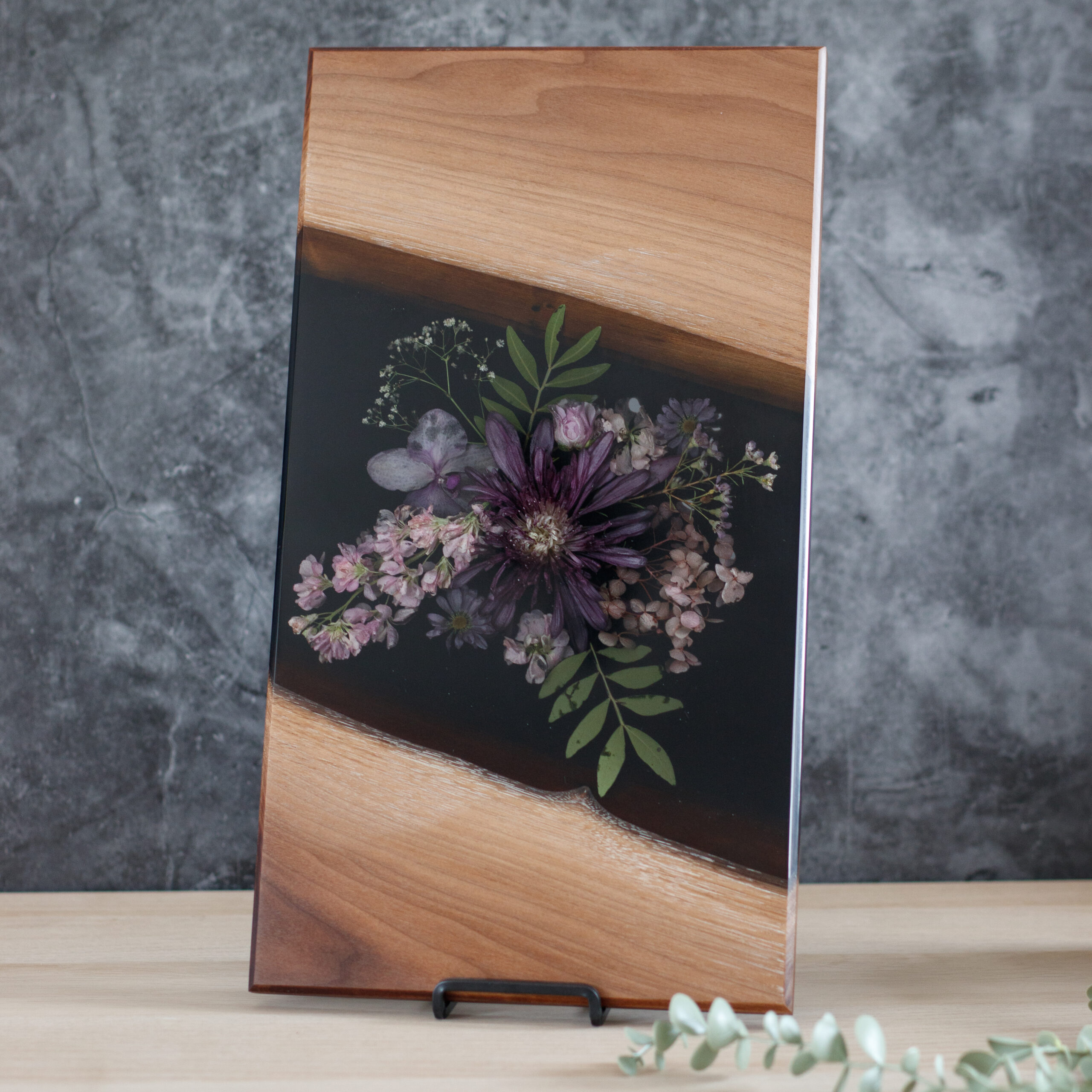 Board is made with American walnut wood, purple, white and pink preserved flowers inside and non toxic food contact safe epoxy resin.