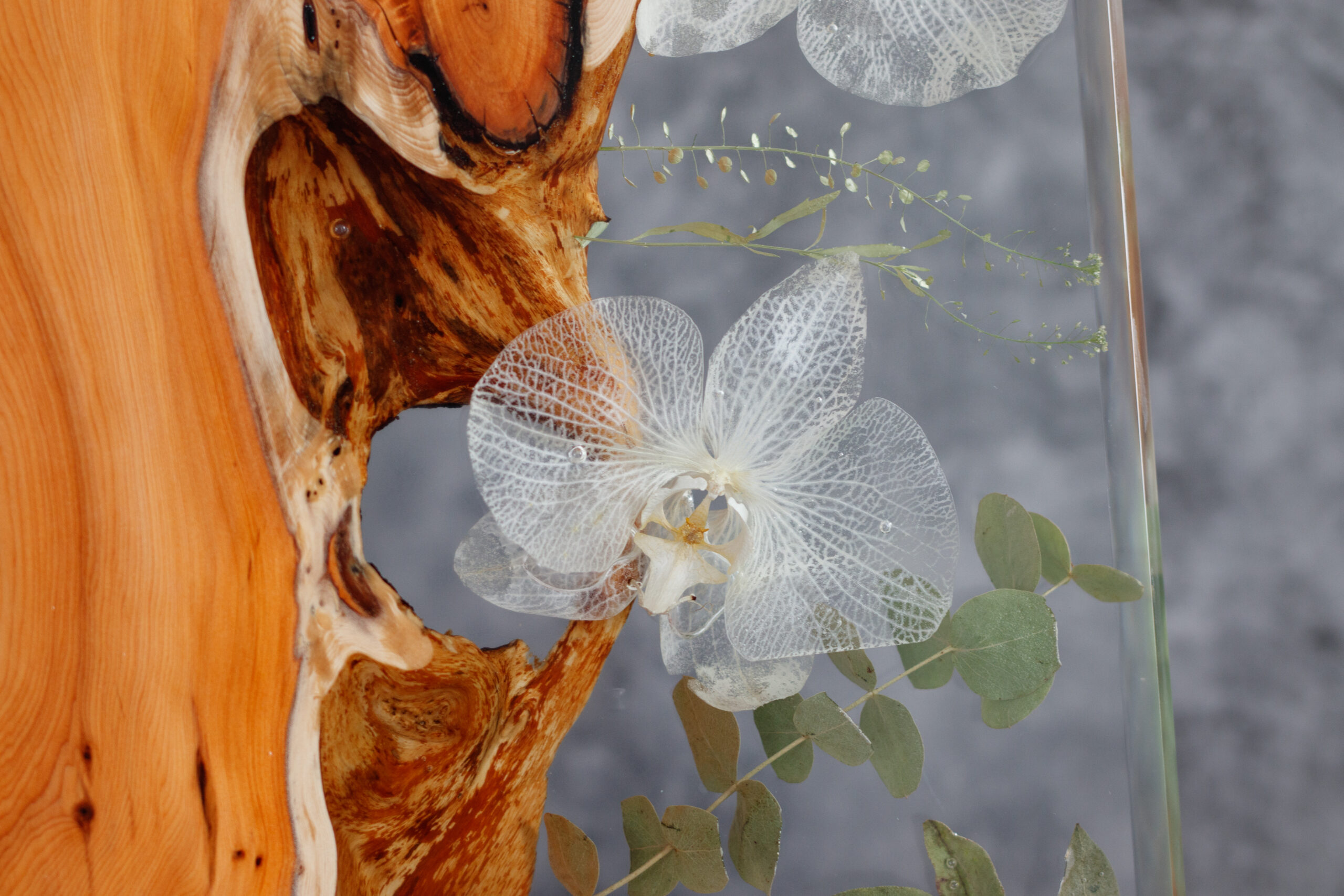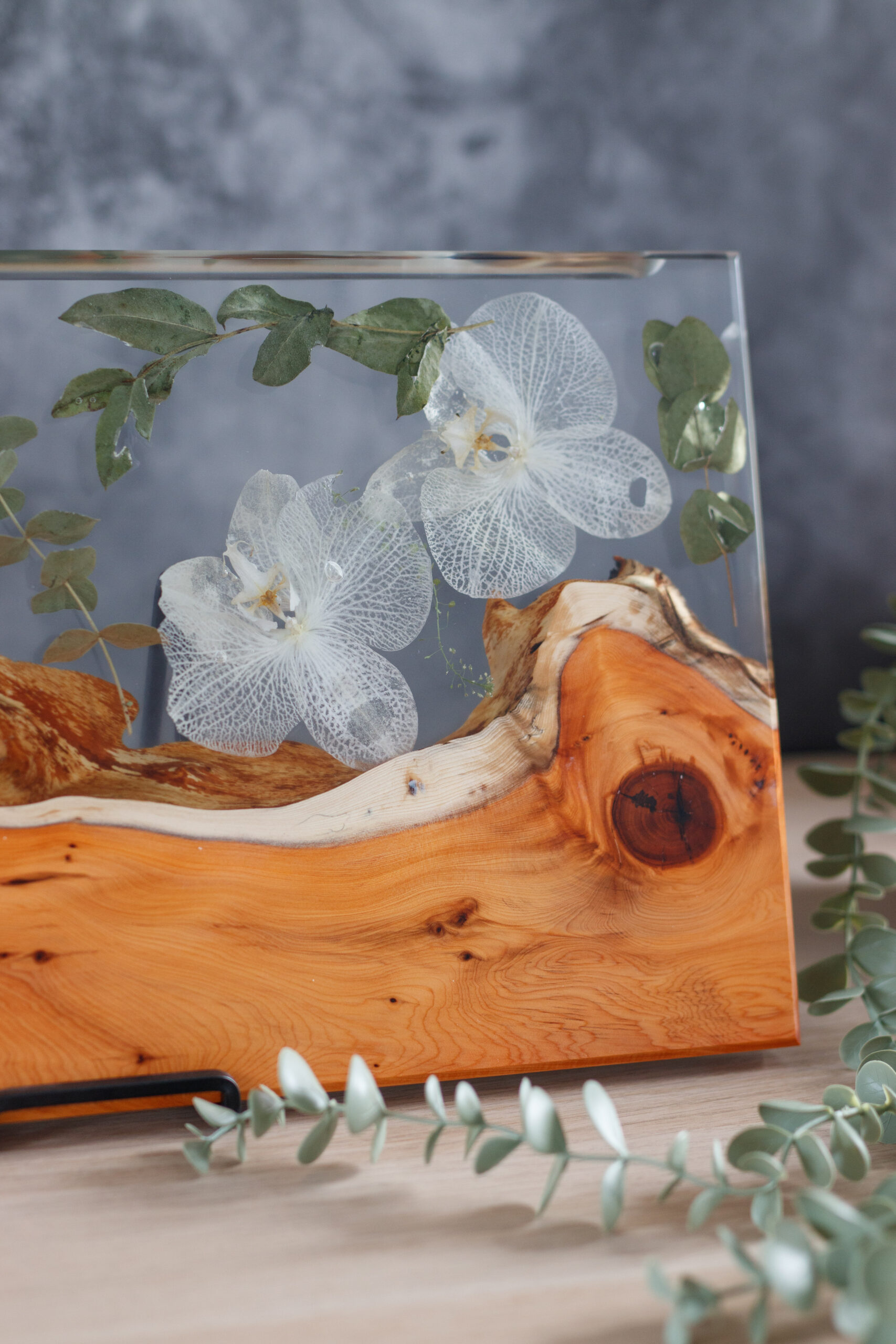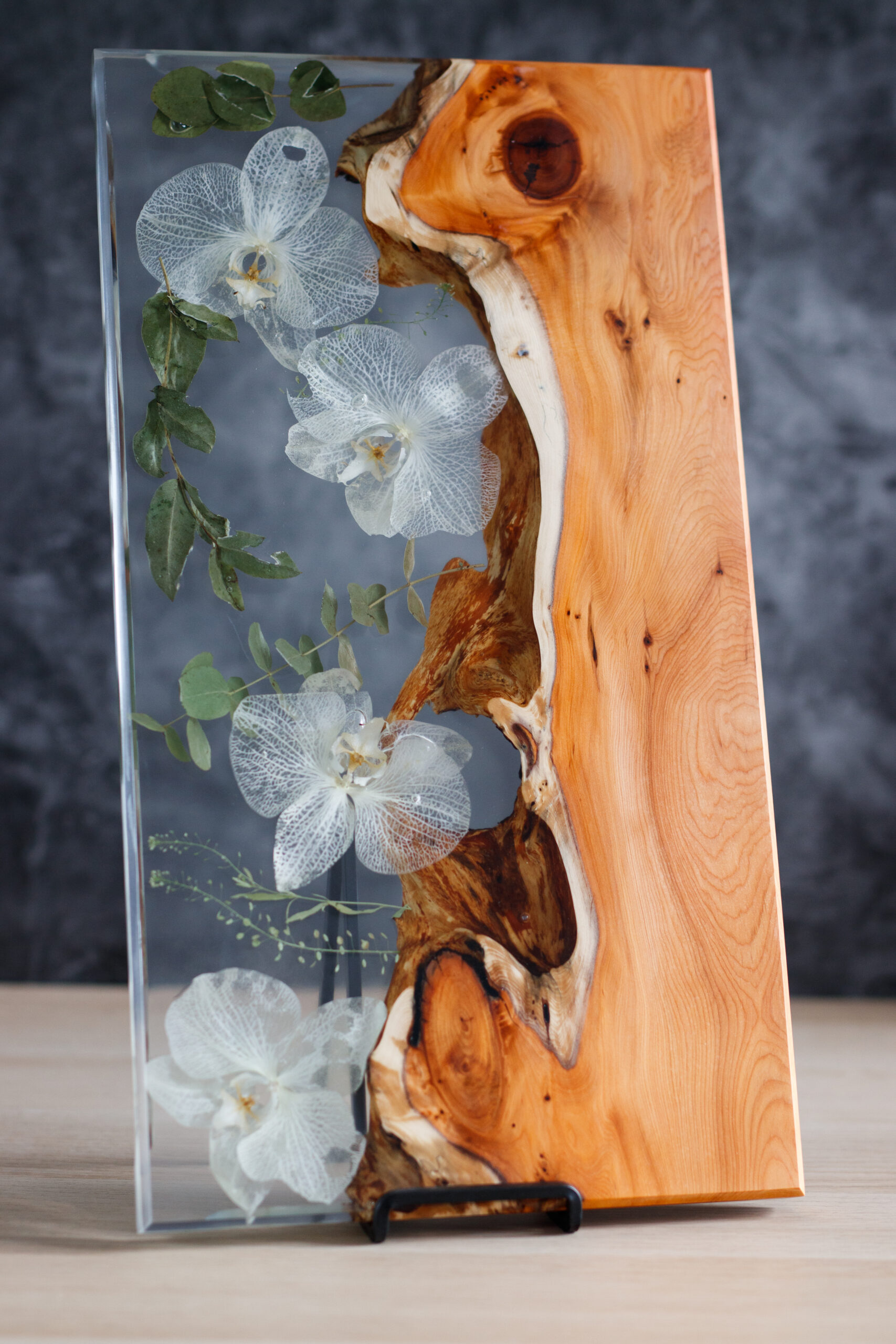 Serving tray is made with yew wood, white preserved orchid flowers inside and non toxic food contact safe epoxy resin.
